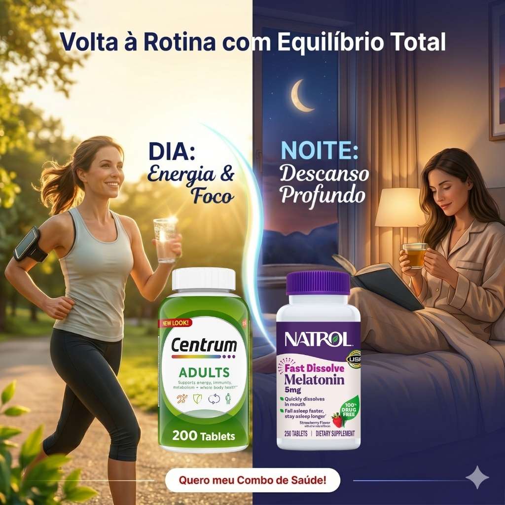 Olá, [[contact.first_name|default: "amigo(a)"]] Esperamos que o seu feriado de Tiradentes tenha sido excelente para descansar! Mas nós sabemos como é: a "quarta-feira com cara de segunda" costuma chegar cobrando o preço. O sono está desregulado, o corpo parece lento e o foco no trabalho fica difícil. É por isso que a Nutrivita Suplementos separou o combo de equilíbrio perfeito que você vê na imagem acima, pronto para te colocar no ritmo certo novamente: ⚡️ DIA: Foco e Energia com Centrum Adultos 200 Capsulas Combata o cansaço pós-feriado. Reponha as vitaminas essenciais que seu corpo precisa para funcionar 100% no trabalho e nos treinos, garantindo imunidade alta e disposição constante. 😴 NOITE: Descanso Profundo com Melatonina Natrol 5mg 250 Tablets Chega de rolar na cama. Regule seu relógio biológico desajustado, durma mais rápido e tenha um sono verdadeiramente reparador para acordar renovado no dia seguinte.